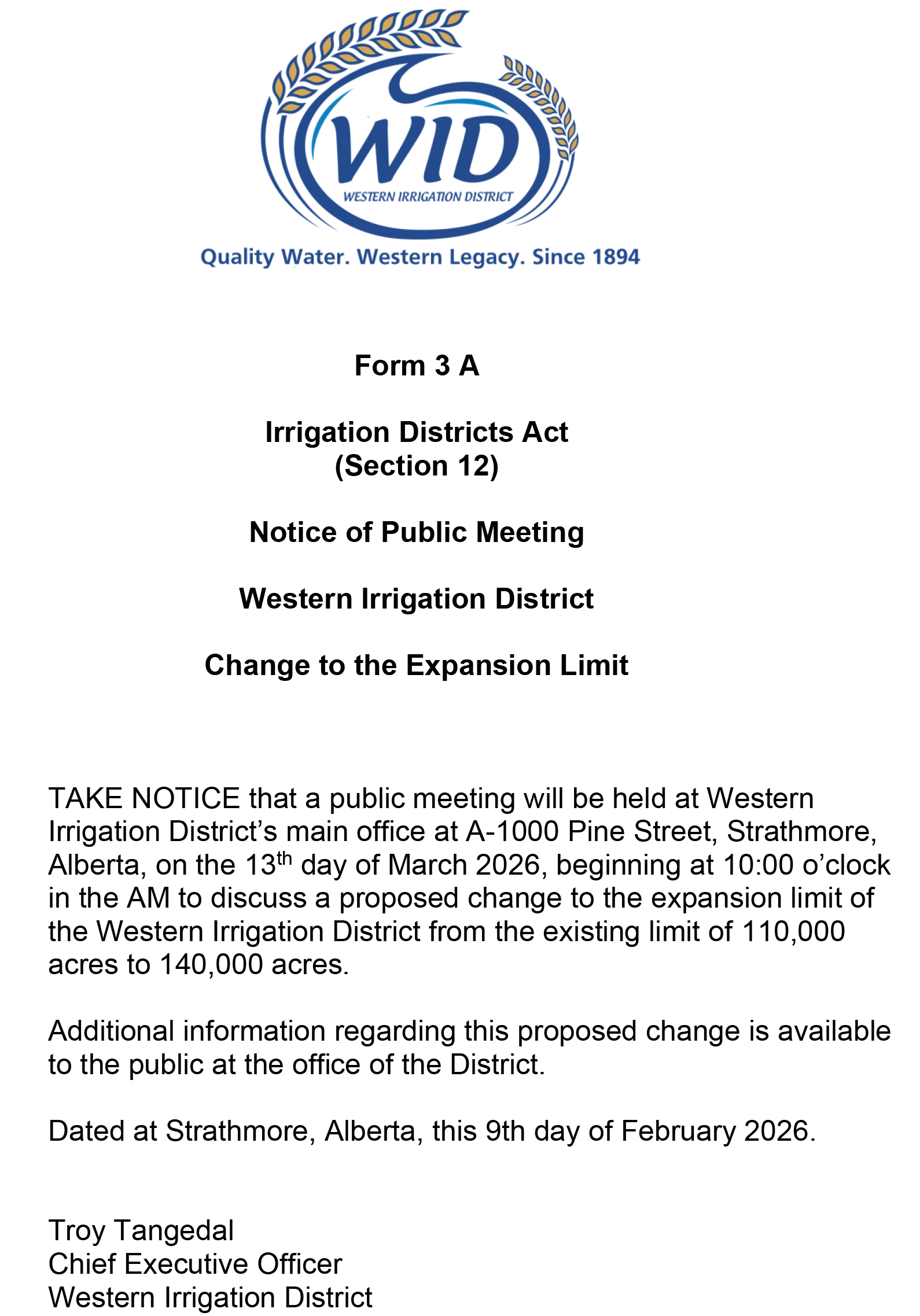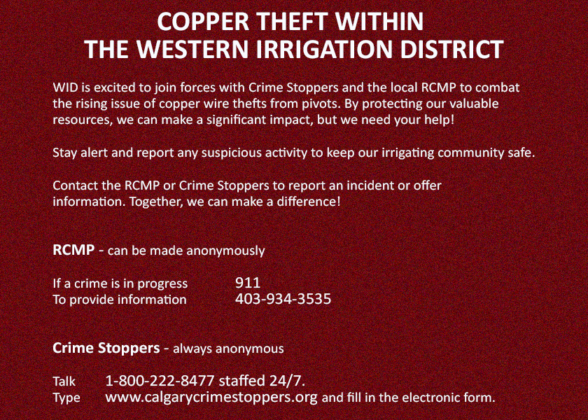 NEWS and UPDATES RCMP UPDATE COPPER THEFT WITHIN THE WESTERN IRRIGATION DISTRICT UPDATE NOTICE TO ALL IRRIGATORS NOTICE TO ALL IRRIGATORS AG SOCIETY APPRECIATION LETTER TO WID UPDATE TO PIVOT CABLE THEFT NOTICE B CANAL SERVICE DISRUPTION COMMUNICATION PROCESS INFORMATION FOR IRRIGATORS NOTICE OF BY-ELECTION NOTICE BOARD OF DIRECTOR CHANGES NOTICE OF NOMINATIONS (for By-Election) Ducks Unlimited Webinar-Wetlands as Fast-acting and Sustainable Natural Climate Solutions Premium Ag Client Meeting Invite & Agenda Irrigation Standards for Mustard Seed Production Research Project WID Signage Update Bow Basin May 2024 Water Supply Outlook Water Update April 30, 2024 NOTICE OF ELECTION BY ACCLAMATION 2024 Notice of Weed Control Treatments Have your say on Bow River Reservoir Options 2024 Reservoir Operations Letter to CAO Chestermere Notice of Nominations – deadline April 17, 2024 July 26 23 – City of Chestermere – 14 Day Notice for the Potential Drawdown of Reservoir Addendum to 2023 Annual Report Add-Remove IA 2023 Western Irrigation District 2023 Annual Report ALTERNATE PARCEL IRRIGATION APPLICATION DEADLINE NOTICE OF ANNUAL GENERAL MEETING Currently Accepting Applications for Irrigation Acres 9% PENALTY CHARGE 2023 WID Office Christmas Closure Dates Changes to Household Water Agreements Shutdown of Canals and Reservoirs for the 2023 Water Season for Irrigators and Residents Water Shut Off September 30 2023 Chestermere Reservoir Fall Schedule 2023 Assessment and Billing Notices Have Been Mailed August 09 23 City of Chestermere – Second Follow-up Notice for the Potential Drawdown of Reservoir July 26 23 – City of Chestermere – 14 Day Notice for the Potential Drawdown of Reservoir Irrigation Water User Update June 2023 Current Irrigation Updates and Plans